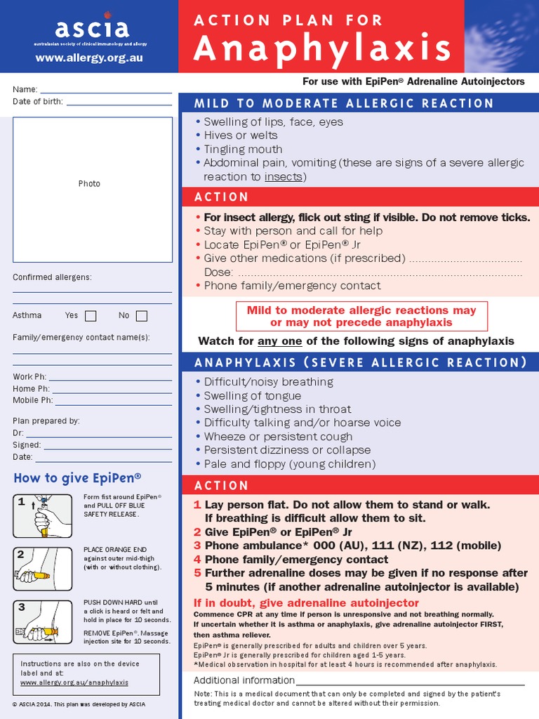 Call an ambulance (000 in australia or 111 in new zealand), immediately after giving an adrenaline autoinjector. 10 action plans serve as an important tool for anaphylaxis education and treatment. For more information read about allergy action plans. If in doubt, give epinephrine. This plan is should be stored with adrenaline autoinjectors in emergency medical kits on airlines. Ascia first aid plans for anaphylaxis (orange) Mouth, tongue, lips until symptoms go away. • shortness of breath, wheezing, or coughing • skin color is pale or has a bluish color Developing an anaphylaxis emergency action plan can help put your mind at ease. Anaphylaxis is a potentially life threatening severe allergic reaction, that requires immediate treatment with adrenaline (epinephrine), which can save lives. Watch for signs and symptoms of anaphylaxis Anaphylaxis action plan _____ _____ name age/dob history of asthma q yes q no allergies q yes q no note: Age appropriate education of people with allergies and their peers or colleagues.